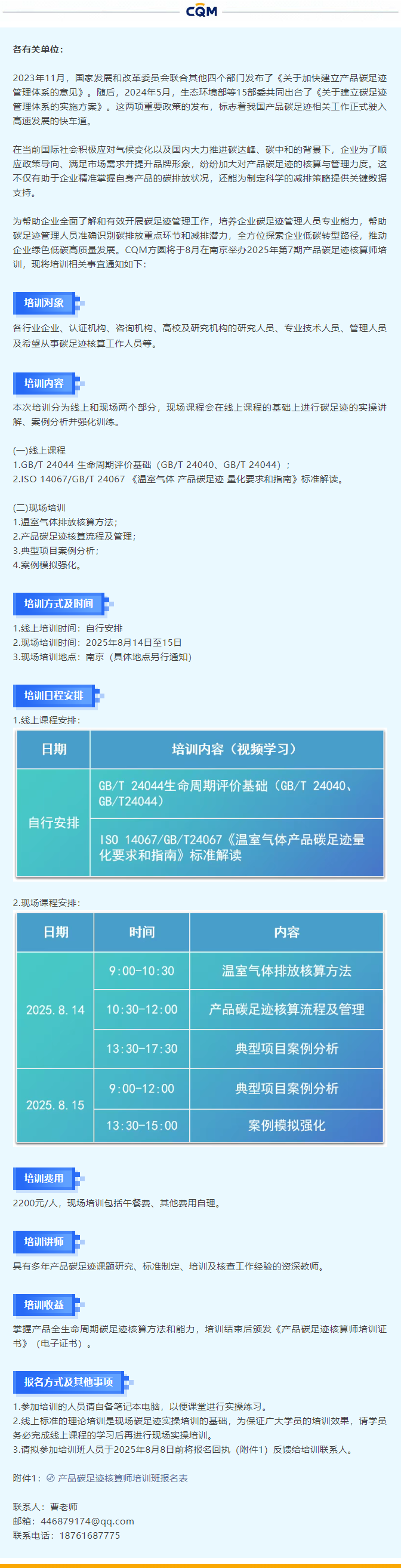 關于舉辦2025年第7期產品碳足跡核算師培訓的通知