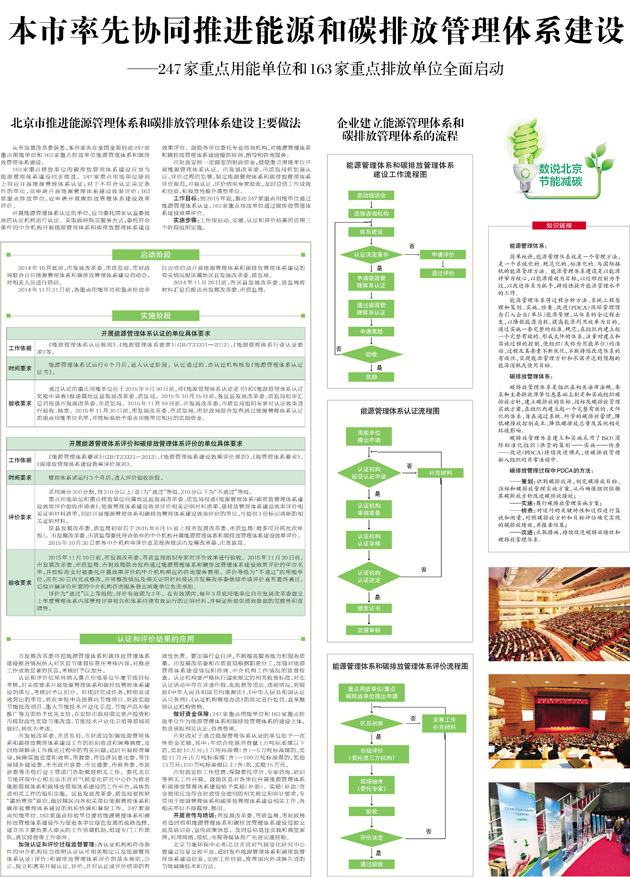 為推動北京市重點用能單位和二氧化碳重點排放單位建立健全能源管理體系和碳排放管理體系,持續改進節能減碳管理,不斷提高能源利用效率,2014年初北京市發展改革委、市質監局、市財政局啟動共同推進在京萬家企業和市級考核重點用能單位能源管理體系建設工作,試點開展碳排放管理體系建設工作,方圓標志認證集團派員積極參與相關研究工作,協助起草制定能源管理體系和碳排放管理體系建設效果評價規則等相關工作文件及宣傳資料。