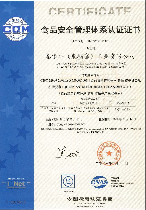 鑫銀豐(柬埔寨)工業(yè)有限公司(XinYin Cambodia Industry Co. Ltd)是一家以干鮮木薯為原料生產(chǎn)乙醇及下游產(chǎn)品的柬埔寨企業(yè),年產(chǎn)6 萬(wàn)噸優(yōu)級(jí)食用酒精,產(chǎn)品主要銷(xiāo)往中國(guó)、中國(guó)臺(tái)灣、菲律賓、馬來(lái)西亞、印度等國(guó)家和地區(qū)。2015年9月,方圓廣西公司了解到該企業(yè)的認(rèn)證需求,及時(shí)組織技術(shù)人員與企業(yè)取得聯(lián)系,并按照 《GB/T 22000-2006 食品安全管理體系-食品鏈中各類(lèi)組織的要求》和 《CNCA/CTS 0021-2008A(CCAA 0015-2014)食品安全管理體系 食用酒精生產(chǎn)企業(yè)要求》指導(dǎo)該企業(yè)建立食品安全管理體系。作為國(guó)際認(rèn)證聯(lián)盟(IQNet)機(jī)構(gòu)成員,方圓品牌、技術(shù)、管理、信息等方面優(yōu)勢(shì)資源及所提供的優(yōu)質(zhì)服務(wù)贏得了企業(yè)認(rèn)可和信任,最終方圓被企業(yè)選擇為認(rèn)證服務(wù)供應(yīng)商,為其提供認(rèn)證技術(shù)服務(wù)。