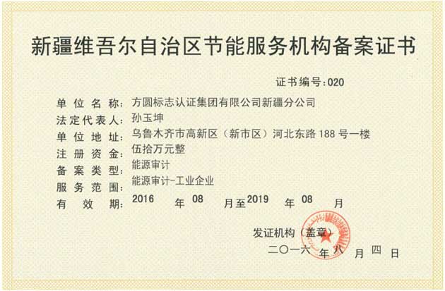 方圓新疆分公司取得新疆地區節能服務機構備案資質