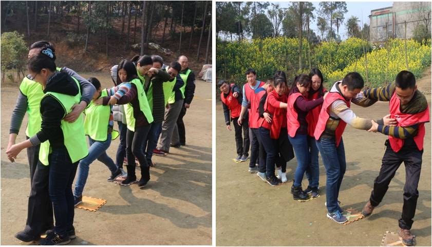“搭橋過河”游戲中,兩隊(duì)激烈的比拼,團(tuán)結(jié)一致,相互幫扶,確保每一位隊(duì)員順利通過,到達(dá)彼岸