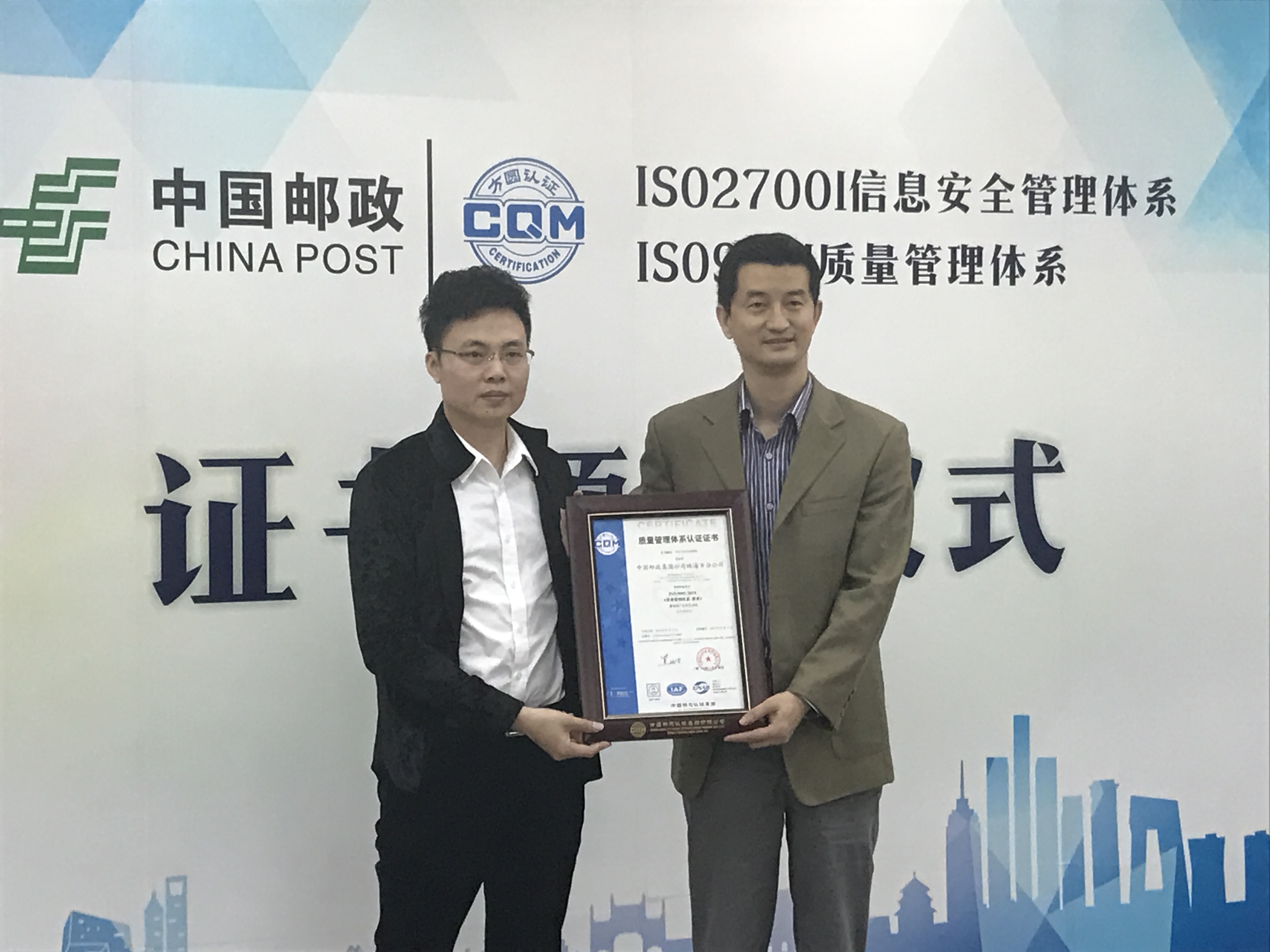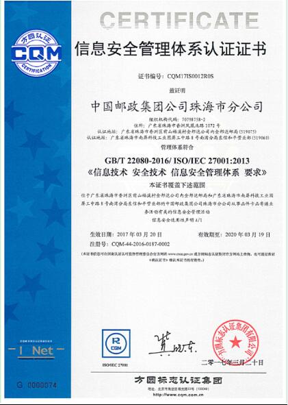 3月31日上午,中國郵政集團珠海市分公司認證證書頒發儀式隆重舉行。方圓廣東公司張耿彬副總經理帶領工作團隊出席儀式,為中國郵政集團珠海市分公司頒發了ISO27001信息安全管理體系認證證書及ISO9001質量管理體系認證證書。