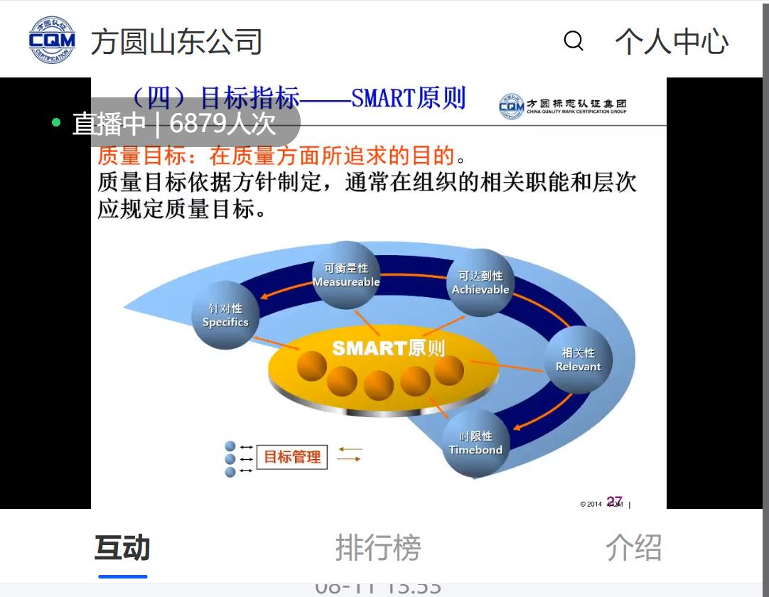 因疫情防控需要,本次培訓采用線上培訓模式,由方圓山東有限公司資深專家曲秀華老師授課。曲老師詳細介紹了質量管理體系概論和GB/T19001-2016《質量管理體系 要求》標準理解及實施,并結合實際案例講解了小微企業如何建立質量管理體系。本次培訓得到了省市場監管局、臨沂市市場監管局、聊城市市場監管局、濰坊市市場監管局及縣區市場監管局的大力支持,截至15:00,登錄平臺學習人次達到6879人次,培訓效果顯著。