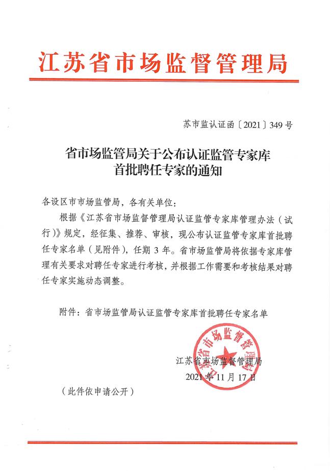 時間:2021年12月03日 近日,江蘇省市場監督管理局發布了《省市場監管局關于公布認證監管專家庫首批聘任專家的通知》,方圓規劃研究(江蘇)有限公司陸凱總經理被聘任為江蘇省首批認證監管專家。根據《江蘇省市場監督管理局認證監管專家庫管理辦法(試行)》規定,認證監管專家將參與江蘇省認證認可發展規劃、制度措施研究,提出針對性意見;參與江蘇省認證認可相關立法及規范性文件起草咨詢;參與各級市場監管部門組織開展的認證監督檢查;參與認證監管課題研究、培訓、宣傳工作等。