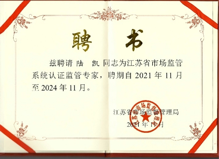 江蘇省市場監管局聘任方圓規劃研究(江蘇)有限公司陸凱總經理為江蘇省首批認證監管專家