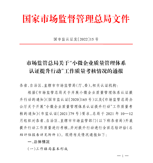 時間:2022年02月11日 日前,國家市場監管總局關于“小微企業質量體系認證提升行動”工作質量考核情況的通報(國市監認證發[2022]15號)文件正式下發,文件從總體情況、考核結果、經驗推廣、下一步工作進行方面進行了總結、部署。從考核結果來看,浙江省市場監督管理局是工作突出的省局之一,方圓浙江公司是行動中突出的認證機構之一。方圓浙江公司根據浙江省市場監督管理局要求,結合小微行動規范要求,輔導的紹興市上虞區的小微案例-“戰疫情練內功,抓質量渡危機”入選國家級小微企業質量管理體系認證提升行動優良案例,也是浙江省唯一入選的案例。