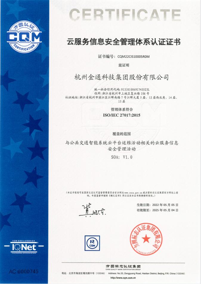 金通科技始創于2009年,由杭州公交集團控股,涵蓋智能化軟硬件開發、建設及整體運營服務,業務聚焦智慧單車、智慧公交和智慧停車,并以5G、云計算、大數據、AI等技術為驅動,為城市提供高品質、全方位的公共交通服務,讓低碳理念深入人心,成為國內領先的公共交通全域數字化一站式解決方案提供商。基于自我要求及為外部提供信任的需求,杭州金通科技集團股份有限公司向我司提出了進行ISO/IEC 27017:2015云服務信息安全管理體系的認證申請。