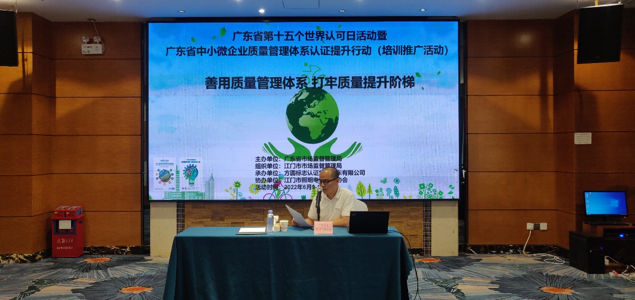 廣東省市場監督管理局認證監管處領導、江門市市場監督管理局領導分別就中小微企業培訓及第十五個“世界認可日”活動發表了講話。同時出席培訓會議的還有2022年廣東省中小微企業質量管理體系認證提升行動的四家中標機構代表,分別是方圓標志認證集團廣東有限公司、威凱認證檢測有限公司、廣州賽寶認證中心服務有限公司、廣東質檢中誠認證有限公司。