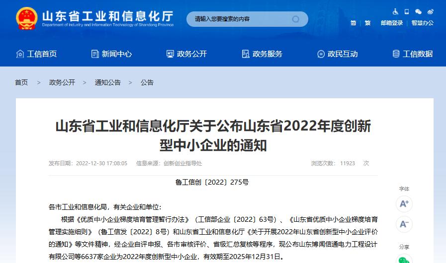 時間:2023年01月03日 近日,根據《優質中小企業梯度培育管理暫行辦法》(工信部企業〔2022〕63號)、《山東省優質中小企業梯度培育管理實施細則》(魯工信發〔2022〕8號)和山東省工業和信息化廳《關于開展2022年山東省創新型中小企業評價的通知》等文件規定,經企業自評申報、各市審核評價、省級匯總復核等程序,山東省工業和信息化廳公布了山東省2022年度創新型中小企業的名單,方圓標志認證集團山東有限公司被認定為山東省2022年度創新型中小企業。