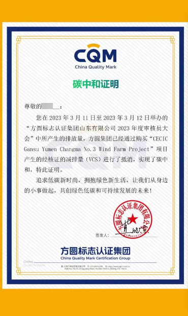 大會籌備期間,根據國家生態環境部發布的《大型活動碳中和實施指南》,方圓山東公司通過購買經核證的VCS項目減排量,實現會議碳中和。作為方圓山東公司的首個零碳會議,我們為每位參會人員頒發了個人碳中和證書,踐行綠色低碳行動,為助力我國碳達峰目標和碳中和愿景的實現,貢獻方圓智慧和力量。
