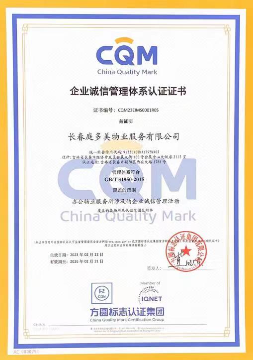 長春庭多美物業服務有限公司高度重視企業誠信管理管理體系建設,嚴格按照GB/T39950-2015《企業誠信管理體系》要求開展體系的建設和運行工作。2023年2月,審核組經過兩階段的認真審核,對其系統化開展企業誠信管理、推行企業誠信落地、提升企業誠信績效等方面給予高度評價,一致認為該公司企業誠信管理體系符合認證標準要求,體系運行規范有效。獲得企業誠信管理體系認證證書,有效提升了公司品牌宣傳價值,增加投標資格,有效防范企業信用風險。