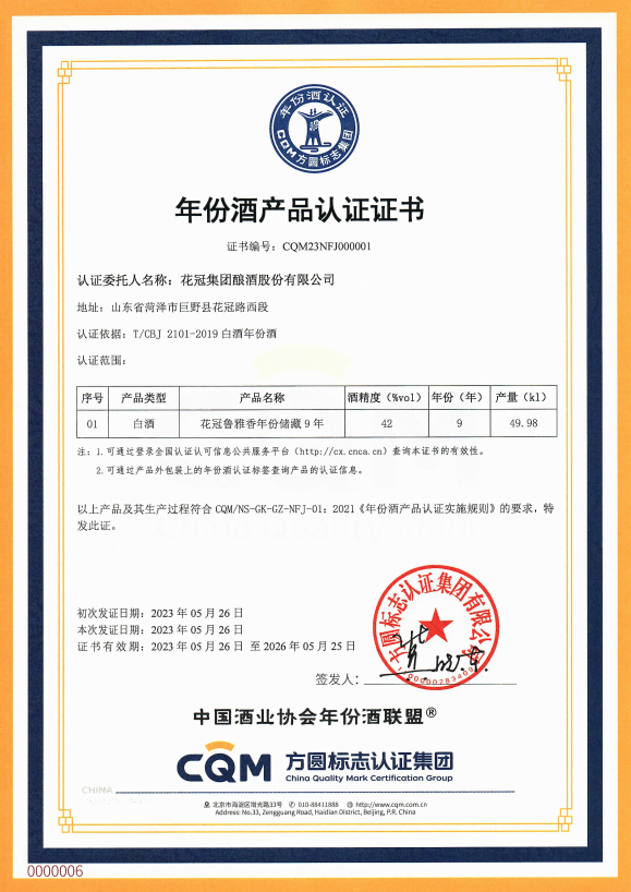 方圓標(biāo)志認(rèn)證集團(tuán)聯(lián)合中國酒業(yè)協(xié)會組建的認(rèn)證專家團(tuán)對花冠酒業(yè)的生產(chǎn)資質(zhì)、生產(chǎn)能力、檢測能力、技術(shù)人員、生產(chǎn)管理以及年份酒基酒存儲量和年份酒產(chǎn)品等進(jìn)行詳細(xì)的現(xiàn)場查驗與論證。經(jīng)過嚴(yán)格認(rèn)證,花冠魯雅香年份儲藏9年產(chǎn)品正式通過認(rèn)證,獲得方圓標(biāo)志認(rèn)證集團(tuán)與中國酒業(yè)協(xié)會聯(lián)合頒發(fā)的年份酒產(chǎn)品認(rèn)證證書和標(biāo)簽,同時報國家認(rèn)監(jiān)委進(jìn)行備案。